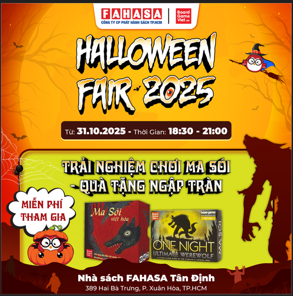 🎃 Sự kiện Halloween Fair 2025 do FAHASA & Board Game Việt tổ chức sẽ diễn ra ngày 31/10/2025 tại FAHASA Tân Định, với hoạt động trải nghiệm Ma Sói miễn phí, nhận quà tặng hấp dẫn, phù hợp cho nhóm bạn, gia đình và người yêu board game.